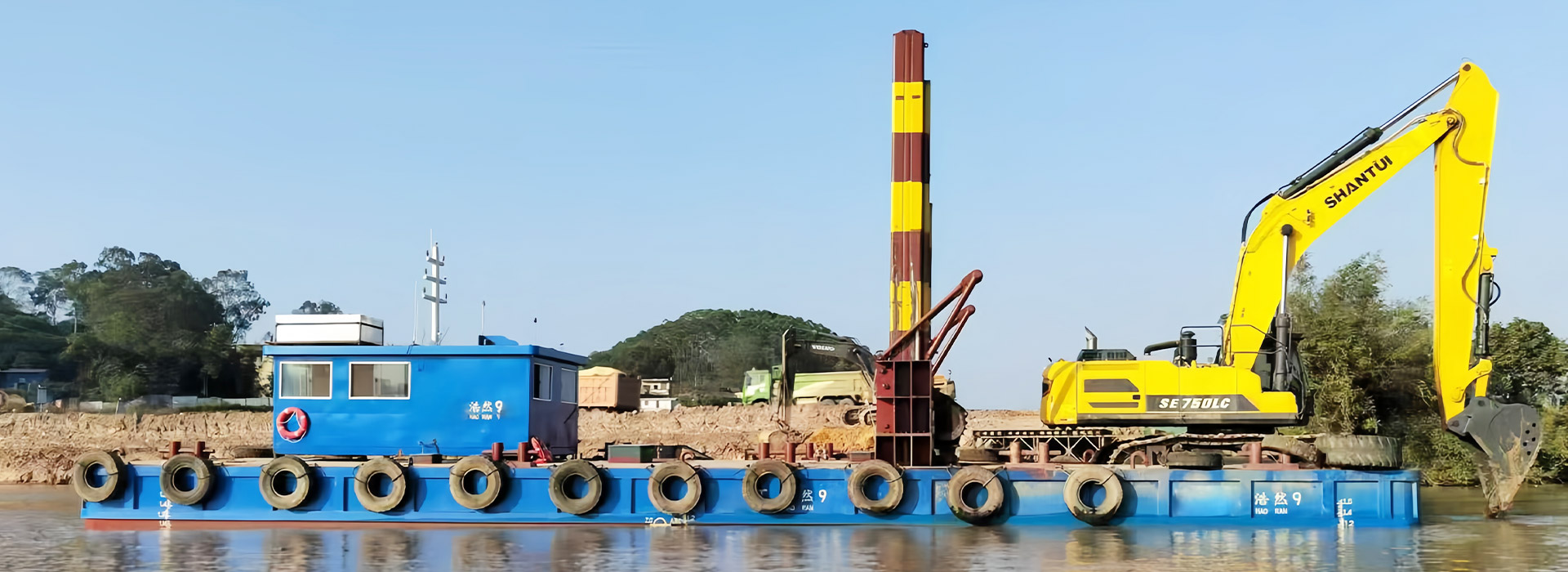 2、施工平臺(tái)穩(wěn)性強(qiáng),方便挖掘機(jī)在深水區(qū)施工作業(yè)。并且,平臺(tái)自帶航行動(dòng)力,便于水上調(diào)遣。